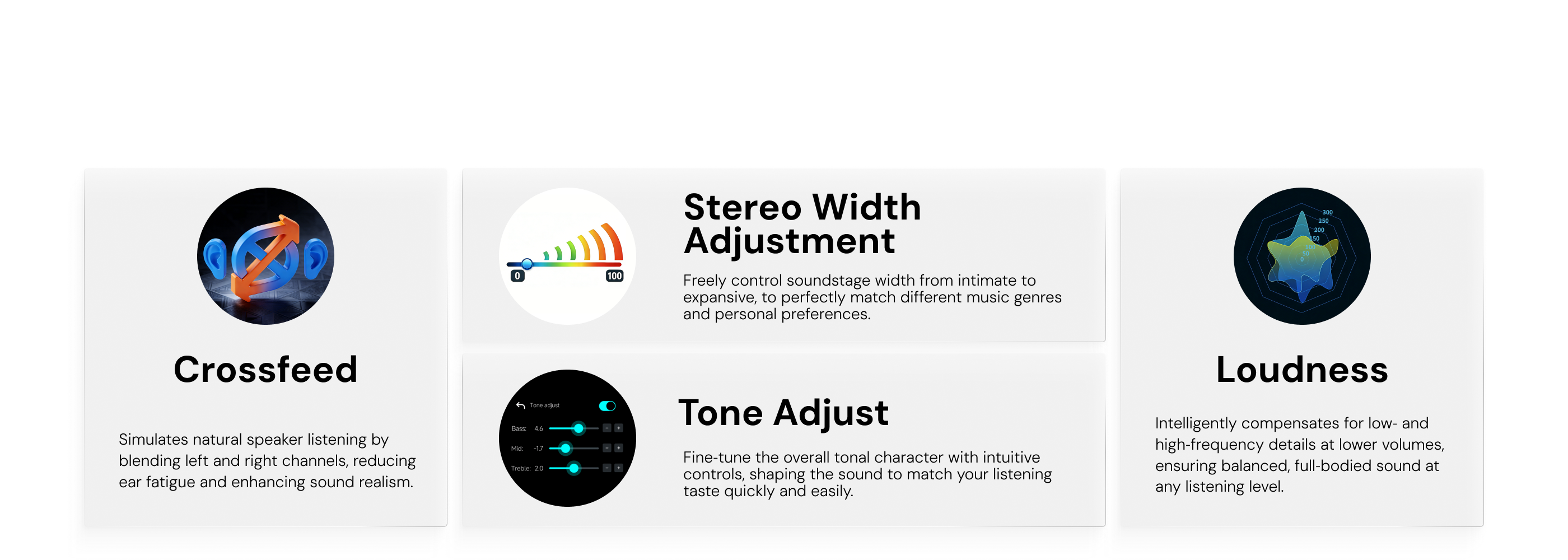 Automatically saves independent settings for each output port, including key parameters such as volume, PEQ, sound effects, and crossfeed. When switching outputs, the system instantly recalls the corresponding configuration, eliminating the need for readjustment and delivering a true plug-and-play experience.